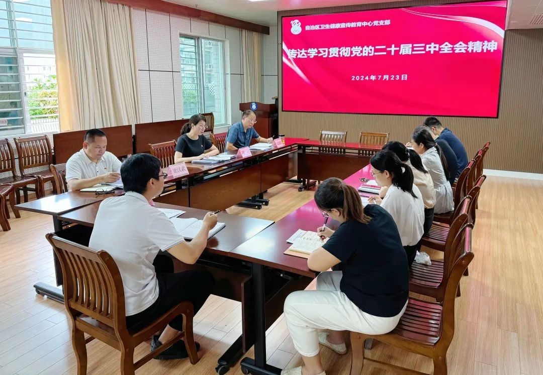 7月23日,自治区卫生健康宣传教育中心党支部召开支委(扩大)会议,传达学习贯彻党的二十届三中全会精神。中心党支部书记、主任周婷主持会议并讲话。支委成员及科室负责人参加学习会。