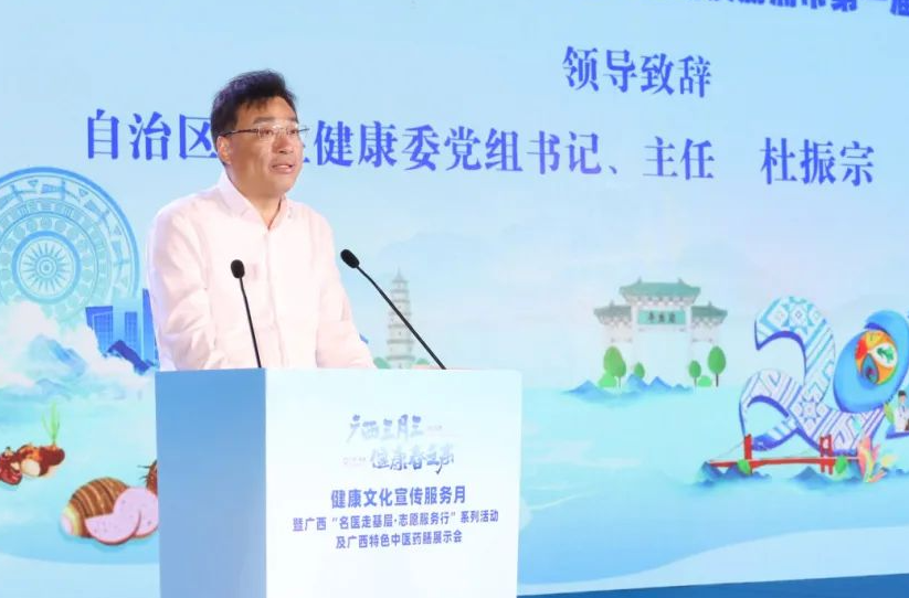 杜振宗在致辞中指出,近年来,在自治区党委、政府的坚强领导下,在各级各部门的大力支持下,广西积极推进健康文化建设,依托“广西三月三”民族传统节日,自治区卫生健康委联合相关部门连续七年举办健康文化宣传服务月活动,聚焦群众对精神文化和维护健康的需求,运用多样化的文化文艺形式和服务载体,打造新时代为民服务的新阵地新品牌,推动文明健康生活方式成风化俗。他强调,全区卫生健康系统要坚持以习近平新时代中国特色社会主义思想为指导,全面贯彻新时代党的卫生与健康工作方针,坚持从以治病为中心向以人民健康为中心转变,统筹卫生健康系统内外的资源优势,注重卫生服务与文化展示相结合,创新开展群众喜闻乐见的健康文化健康知识惠民活动,进一步推动服务载体品牌化、服务内容科学化、服务形式多样化,促进文明健康生活方式成风化俗,做到健康文化健康知识“常下乡”“常在乡”“常惠乡”。