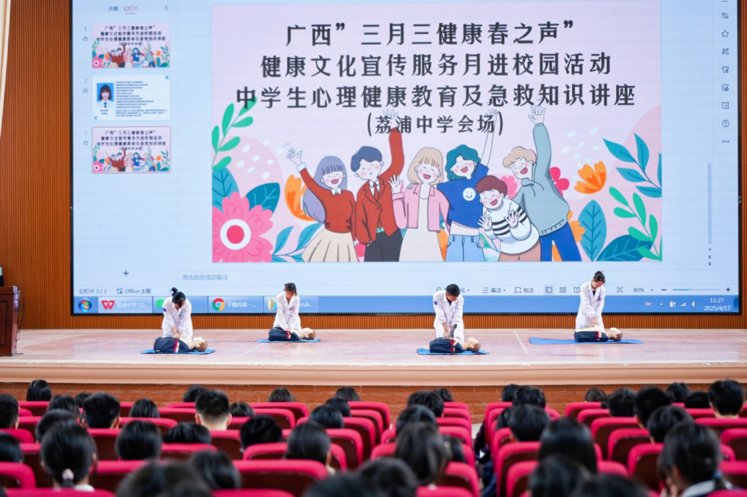 4月17日活动期间,自治区、桂林市和荔浦市三级专家领衔的“健康特派员”团队,深入荔浦滨江公园广场、新坪镇桂东村开展义诊,到荔浦中学、荔浦江滨小学、荔浦市规划工业园,结合当地健康服务需求,针对性开展心理健康、近视防控、职业健康、急救现场实操等健康知识讲座。